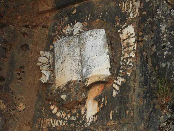 Manuel Gomez Camacho Se da la circunstancia que después de esta limpieza han aparecido varios detalles que se encontraban ocultos, la pabrabra CABRA debajo del libro, la letra RaL, los agujeros de donde están colocadas las argoyas que fijan la placa de piedra y un detalle que se desconocía hasta ahora el libro fue encastrado posteriormente en el marco.