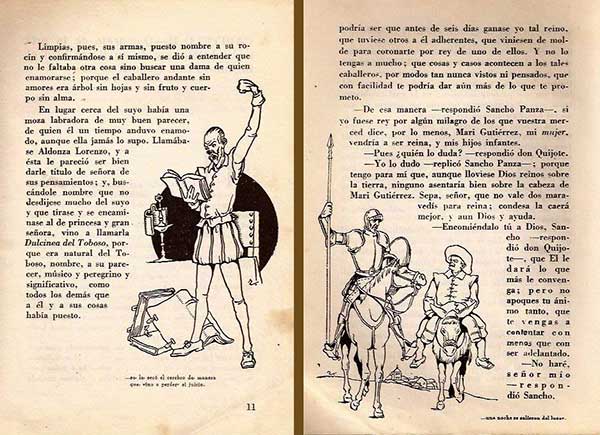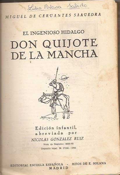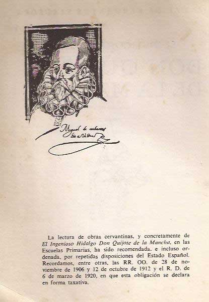Nº 19. Miguel de Cervantes Saavedra / El Ingenioso Hidalgo Don Quijote de la Mancha / Una edición infantil abreviada de 1965, con la idea de acercar esta obra cumbre de las letras a los niños. En las ilustraciones podemos ver el busto de Cervantes con su firma y rúbrica. A continuación un versión del mapa de la ruta de don Quijote, editado por Ibarra en Madrid, 1780, más dos páginas donde vemos al Caballero de la Triste Figura don Quijote y su fiel Escudero Sancho Panza.