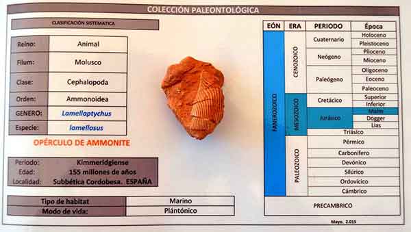 Este ammonites está parcialmente cristalizado en calcita. La zona tabicada (fragmocono) se encuentra rellena de calcita, el agua circuló por el interior del ammonites y precipitó el Carbonato Cálcico en el interior. Normalmente no suele ocurrir esta cristalización en el interior de la concha de los ammonites que encontramos en nuestras Sierras Subbéticas